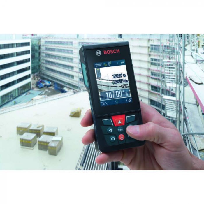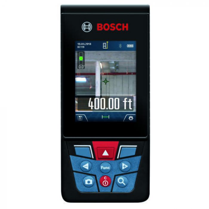 The Bosch BLAZE™ Outdoor GLM400CL Connected Laser Measure with Camera features an adjustable zoom camera to find the laser spot in bright conditions, measuring up to 400 Ft. Transfer the measurement documentation to a smartphone or tablet with Bluetooth® using Bosch’s MeasureOn app.