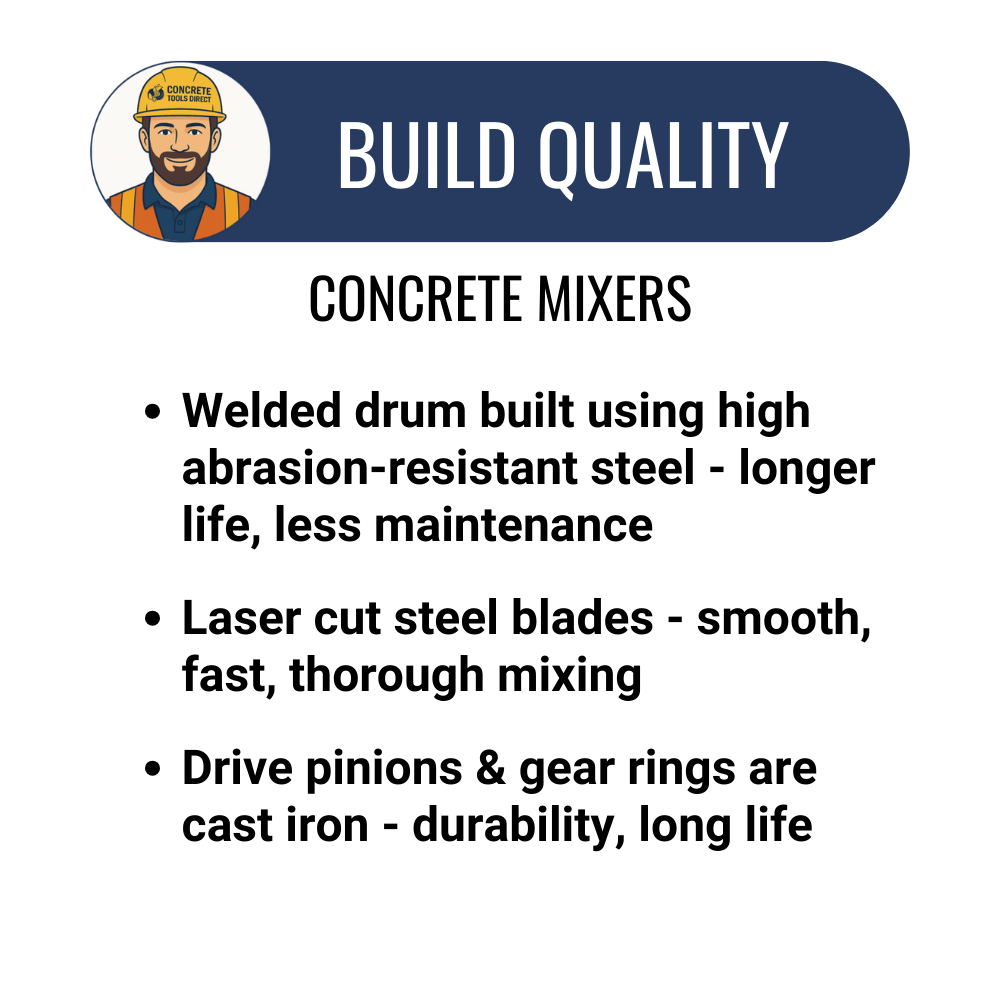 With a durable steel drum and heavy-duty frame, this mixer is built to last and ready for daily job site use.