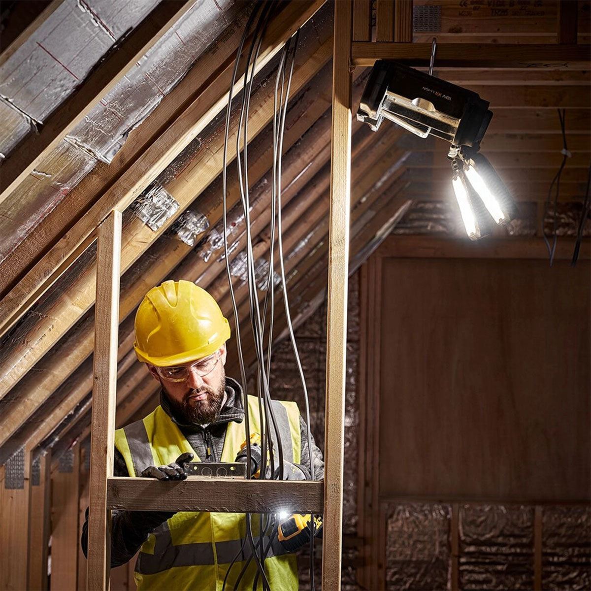 360º light coverage illuminate jobsites by using the unit freestanding, stacked, mounted, or hung using its folding wire hook.