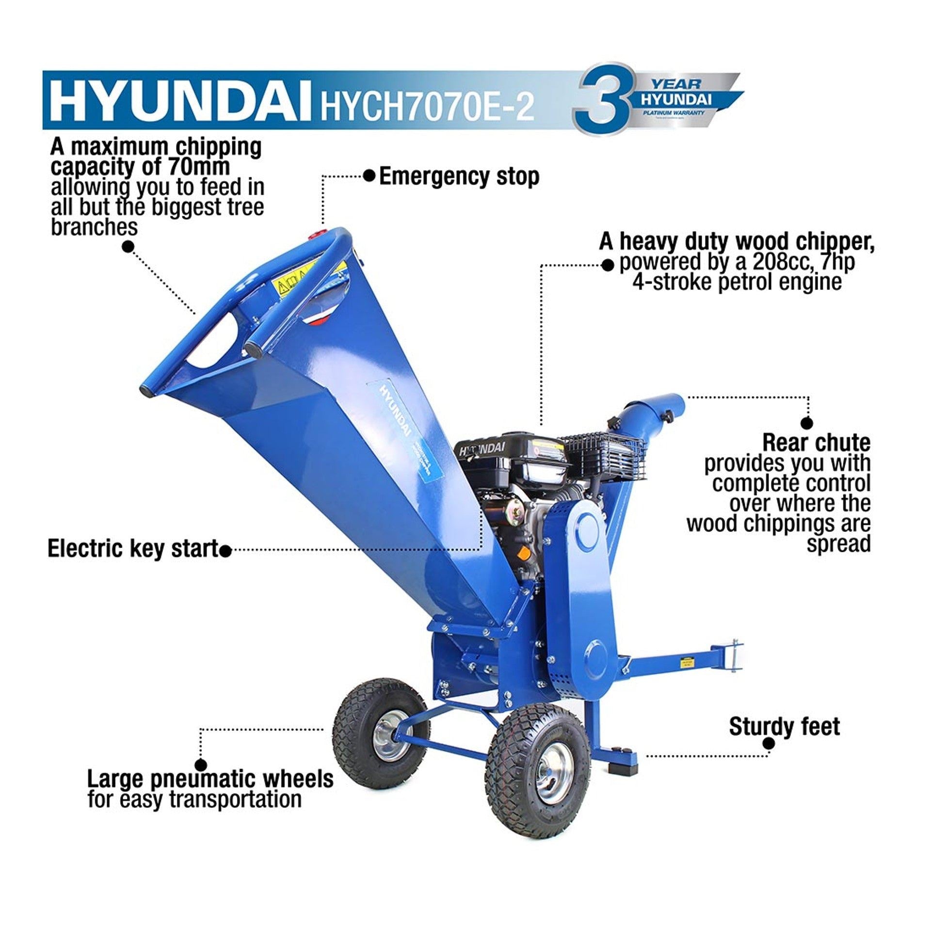 Hyundai HYCH7070E-2 is a compact yet powerful chipper powered by a heavy-duty 212cc / 7hp 4-stroke OHV electric-start Hyundai engine, it will provide you with a powerful performance – as well as being incredibly easy to get started – transforming piles of garden waste into manageable compostable material effortlessly. Its front handle and 2 off-road pneumatic tyres makes it so easy to move between jobs around your garden or rough terrain. Also, the emergency stop bar is convenient and easy-to-reach to minimise any accidents and to maintain complete control over your chipping. It also has sturdy feet to keep the shredder static during use.