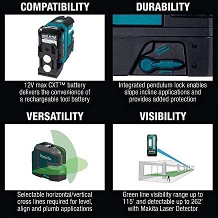 - Green line visibility range up to 115’ depending on ambient light and detectable up to 262′ with Makita Laser Detector LE00855702 (sold separately)
