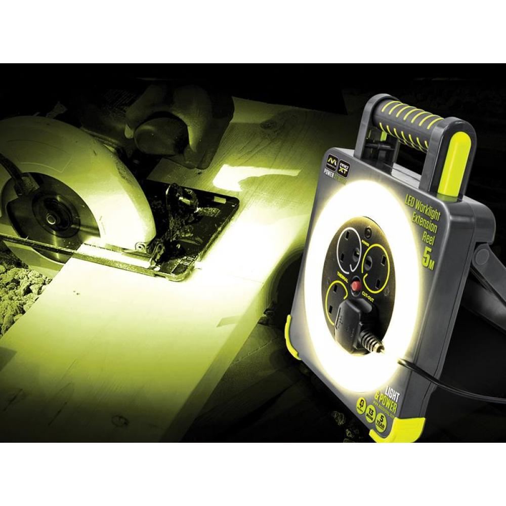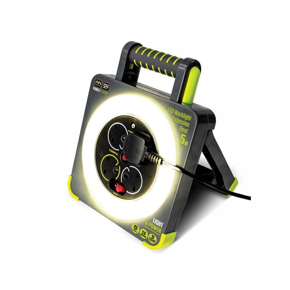 The Masterplug Work Light Cable Reel provides both light and power for home and heavy-duty applications.