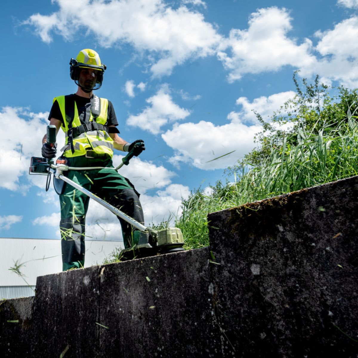 The Metabo FSB 36-18 LTX BL 40 is a powerful cordless grass trimmer, designed for efficient trimming on larger areas. Its adjustable bike handle provides comfortable handling, while the twin line spool and blade compatibility offer versatility for both grass and brushwood cutting. The quick thread change system allows for fast, tool-free line replacement, and stepless speed control ensures flexibility in various conditions. Built for durability, it features a metal motor housing and battery hoop guard for protection. Ergonomic and well-balanced, it includes an adjustable shoulder strap and rubberized grip areas for fatigue-free operation.