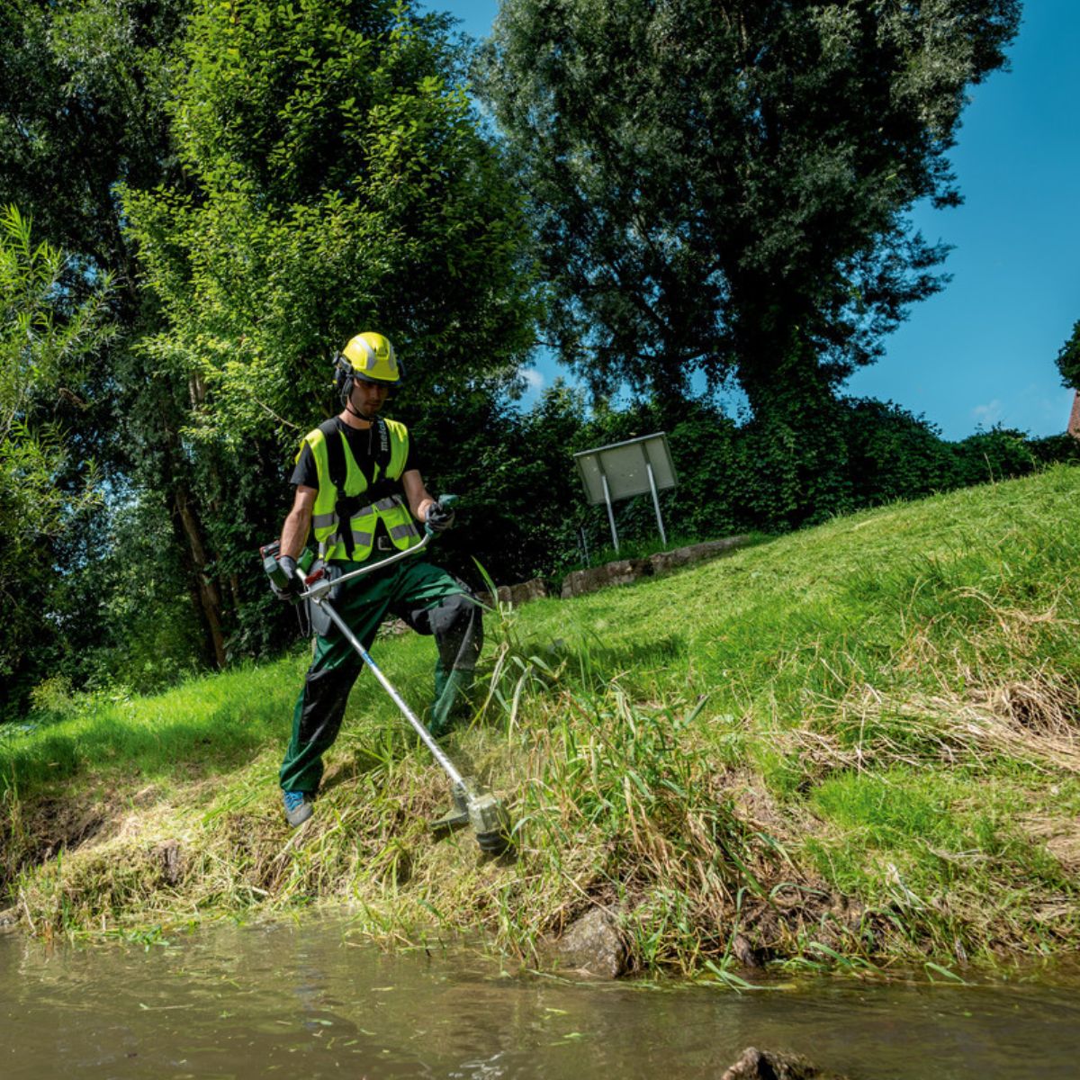Quiet cordless brush cutter with adjustable bike handle for comfortable working on larger areas