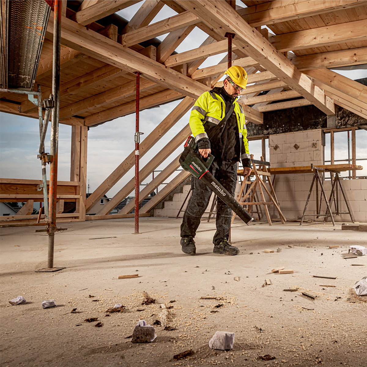 The Metabo LB 18 LTX BL Leaf Blower offers powerful, cordless performance for efficient removal of leaves and debris. Equipped with a strong brushless motor, it ensures long runtimes and high performance. Its steplessly adjustable air velocity allows for precise control of the blowing force, while the lockable speed control trigger provides constant power in continuous mode. Lightweight and ergonomically designed with a rubberized grip, it minimizes fatigue during use. The blower also features a padded shoulder strap for better comfort and a metal-protected blowing tube for durability.