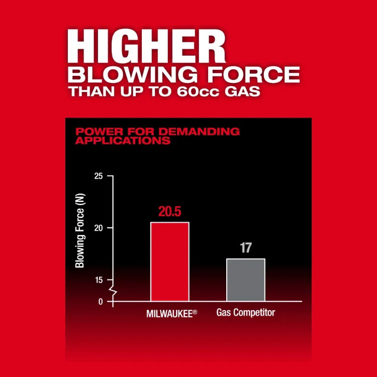Our M18 FUEL™ Dual Battery Backpack Blower is designed for the outdoor trades, delivering a higher blowing force than up to 60cc gas. The POWERSTATE™ Brushless Motor Delivers a constant 650 CFM, 155 MPH, and 20.5 Newtons of blowing force and reaches full throttle in under one second, boosting productivity and control. The blower requires (2) M18™ REDLITHIUM™ Batteries for operation while providing (2) additional battery terminals to extend runtime. When using the recommended (4) M18™ REDLITHIUM™ HIGH OUTPUT™ 12.0 Batteries (not included), the blower delivers 30 to 60 minutes of continuous use based on the selected mode. This adjustable battery setup allows the operator to adapt the number of batteries for either lighter weight in quicker clean-ups or longer runtime in extended clearing applications. With a customizable battery configuration combined with a fully adjustable harness, mode select, telescoping nozzle, variable speed trigger, and low noise level of just 62dB(A), this backpack blower provides the most adaptive design and comfort to meet the wide range of application and operator needs. Our M18 FUEL™ Dual Battery Backpack Blower is part of our M18™ System, fully compatible with over 250+ solutions.