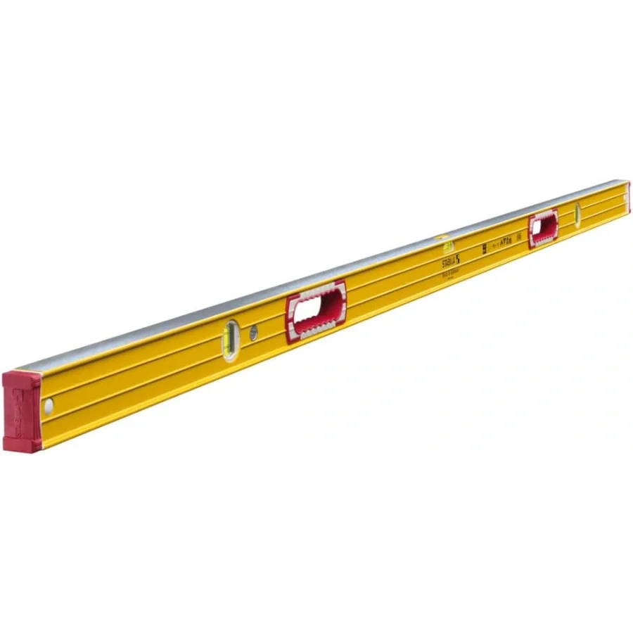 STABILA’s 6-foot Type 196 spirit levels are designed with extra-rigid rectangular box beam aluminum profiles reinforced with ribs for exceptional strength. They include milled measuring surfaces, ergonomic hand holes, and removable shock-absorbing end caps with anti-slip wall grips. The precisely matched vials guarantee consistent plumb readings in both normal and reverse positions. These hand tools are the most popular STABILA box frame spirit levels in North America!