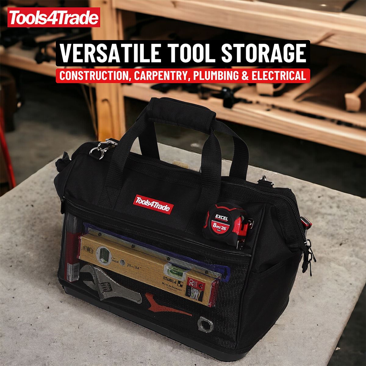 Stay organized and ready for any task with the Tools4Trade 18″ Tool Bag. Crafted from heavy-duty material, this bag features a tough hard base for added durability and stability. With multiple pockets for easy organization, your tools will always be within reach. Perfect for professionals and DIY enthusiasts alike, this versatile tool bag offers reliable storage and portability, ensuring your tools are secure and easy to access wherever you go. Keep your workspace tidy and efficient with this must-have tool bag.
